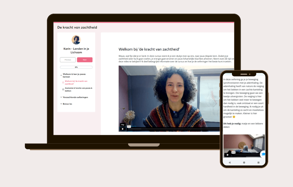 In de online cursus De Kracht van Zachtheid ontdek je hoe je kunt vertragen, diepgewortelde spanning in je lijf loslaat en je lichamelijke klachten verlicht. Met zachte, eenvoudige oefeningen voor een zachtere psoas help je je lichaam te ontspannen. Geen ingewikkelde technieken, geen urenlange sessies—wel een liefdevolle manier om thuis te komen bij jezelf.