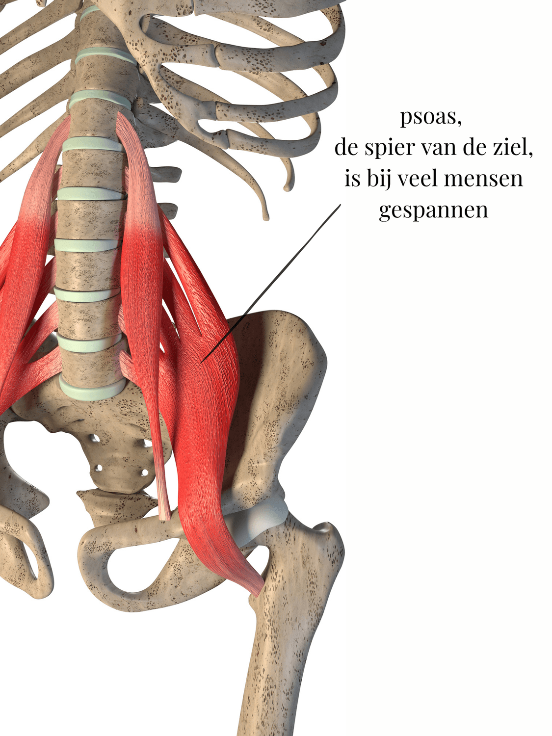 Ik ontdekte dat een soepele psoas (ook wel de fight or flight spier, of de zielsspier genoemd) cruciaal is om de verbinding met je lichaam te herstellen. Een gespannen psoas zet je buik op slot, en veroorzaakt klachten als lage rugpijn, bekkenklachten en het afsluiten van je emoties.